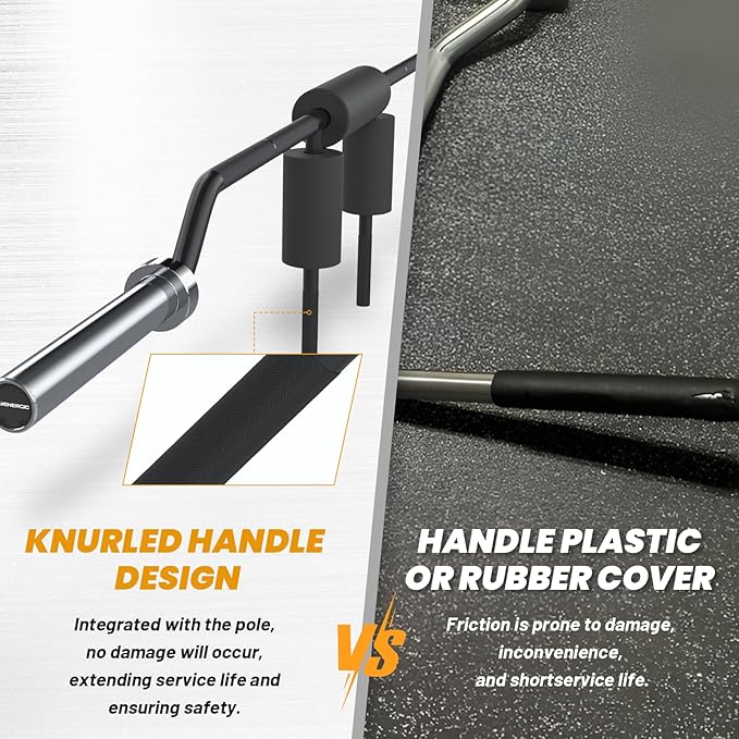 - Handles Knurled Design: Provides better grip and reduces the possibility of the bar slipping from your hands during heavy lifts. It also helps in distributing the weight evenly across your hands, reducing pressure on your wrists