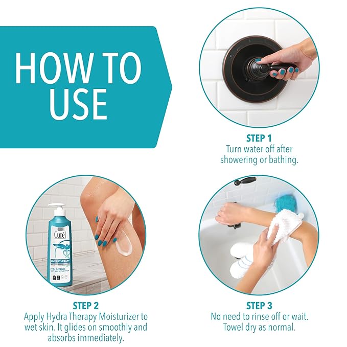 - SKIN HYDRATION WITH NO RESIDUE - Curel fast absorbing lotion allows for wet, in-shower application and immediate absorption so you can towel off and go