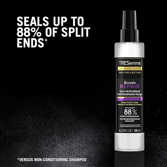 - KERATIN REPAIR HAIR TREATMENT: TRESemmé Keratin Repair Leave in Conditioner Spray helps to visibly repair hair by sealing up to 88 percent of split ends (vs. a non-conditioning shampoo)