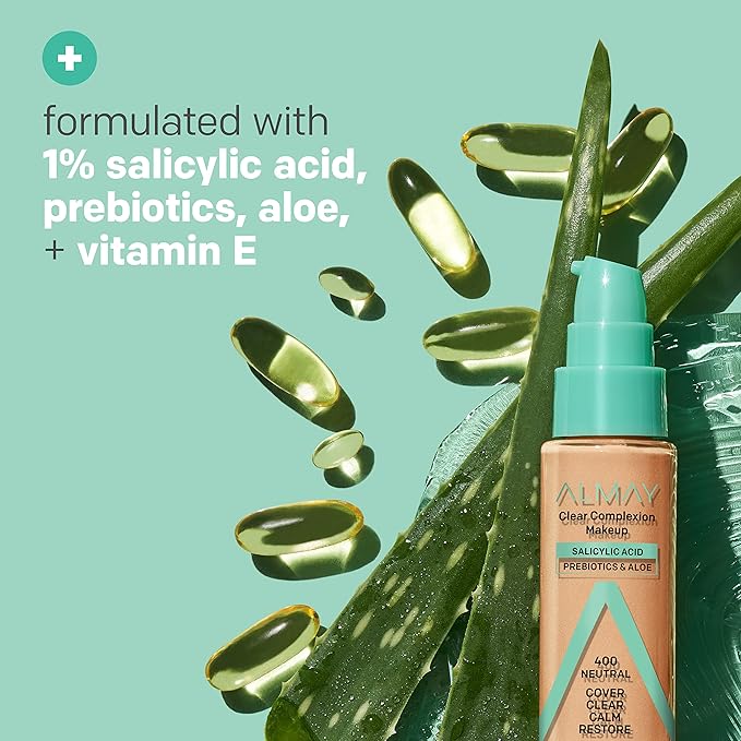 Almay Clear Complexion Acne Foundation Makeup with Salicylic Acid, Medium Coverage, Soft Matte Finish, Hypoallergenic, Cruelty- & Fragrance-Free, Dermatologist Tested, 600 Sun Beige, 1 fl oz