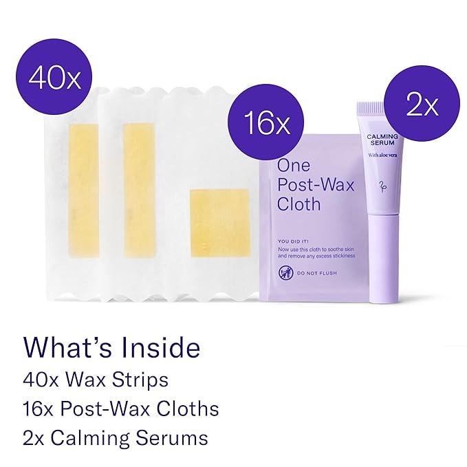 - PACK OF TWO WAXING KITS: This pack of two self waxing kits for women contains 2 Face Wax Kits for hair removal, and each kit includes 20 Face Wax strips, 8 Post-Wax Cloths and 1 roll-on Calming Serum