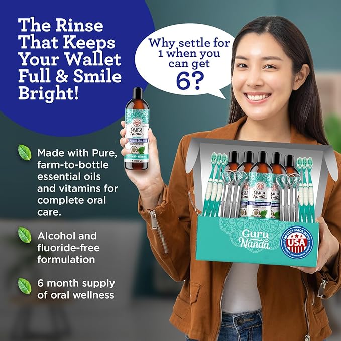 GuruNanda CocoMint Oil Pulling Mouthwash for Complete Oral Hygiene, 7 Essential Oils & Vitamins for Happy Teeth & Gums & Fresh Breath, Alcohol-Free, 6X8 oz