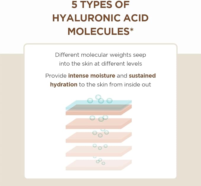 - Contains 5 sizes of hyaluronic acid molecules to layer moisture into the skin from the inside out.