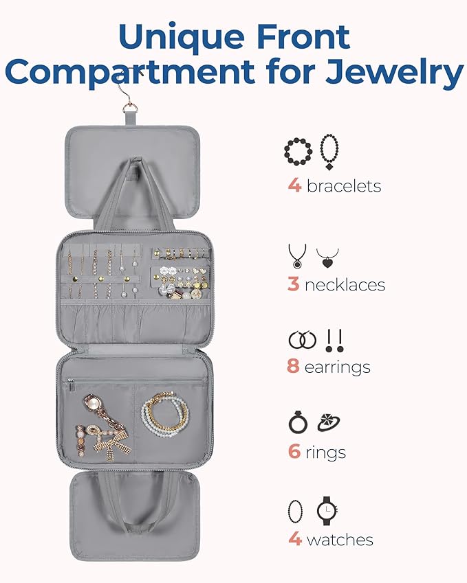 - ๐๐๐ฐ๐๐ฅ๐ซ๐ฒ ๐๐จ๐ฆ๐ฉ๐๐ซ๐ญ๐ฆ๐๐ง๐ญ: Bagsamrt toiletry bag is design with jewelry organizer compartment. Adding a compartment in the front pocket of travel bag for rings, ear rings, bracelets, bangles, necklaces, and other jewelries, meeting your travel toiletries and makeup needs