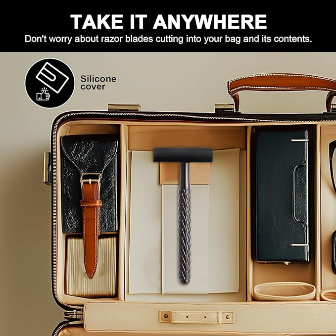 - 【Protective Silicone Cover】 Equipped with a silicone sleeve, our safety razor provides superior protection for both the razor head and blades. This not only makes it convenient for travel but also extends the razor's durability, keeping it in top condition for longer periods. Whether you're on the go or at home, your razor stays safe and secure.