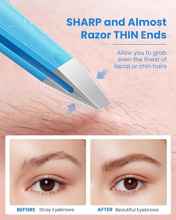 - 【Sharp SLANT TIPS for Every Hair】25° slanted tip is the perfect angle for removing unwanted hair. These ultra-fine tips grip the tiniest hairs effortlessly - from peach fuzz to stubborn chin hairs. Unlike flimsy tweezers, our professional-grade design removes hairs cleanly without breakage. Perfect for women's facial hair care routines and men's grooming kits alike.