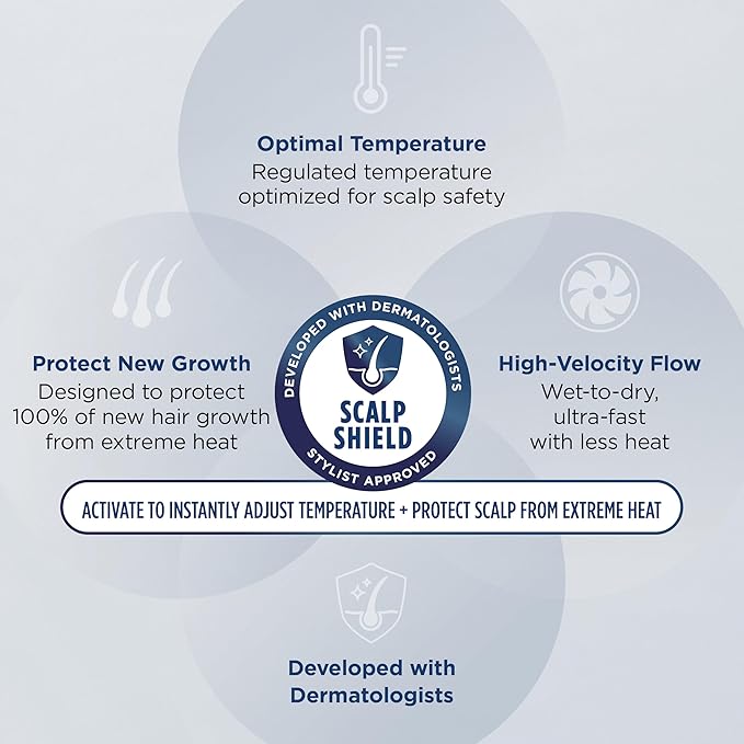 - Scalp Shield: Developed by dermatologists. Approved by stylists. Activate to instantly adjust temperatures and protect your scalp from extreme heat. Designed for ultra-fast wet-to-dry styling with less heat exposure to protect 100% of new hair health.