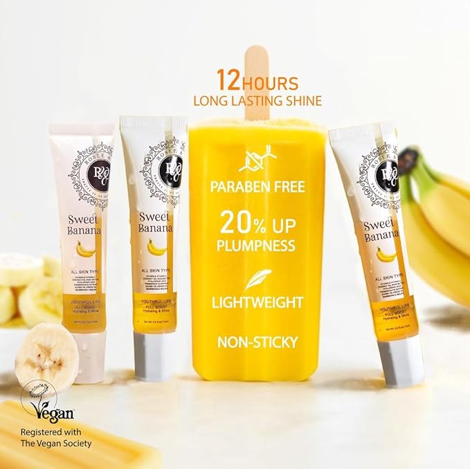 ROSÉE & CO Rosee Lip Gloss Vegan & Cruelty Free Treatment, Professional Make up, Long Lasting Glossy with Shea Butter, Moisturize, Protect & Smooth, High Shine, Non-Sticky (s. Sweet Banana, 0.5)