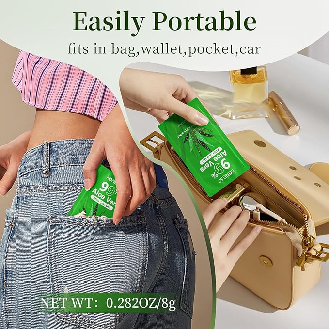 - 【99% Pure Aloe Vera Gel】This set of aloe vera gel has 100 packs,each pack is 0.282oz,each pack of aloe vera gel is individually packaged,which is very suitable for carrying around,when you use these aloe vera gel,you will feel very relaxed and cool,it quickly absorbed,and free of any sticky residue,leaving your skin moisturized and smooth