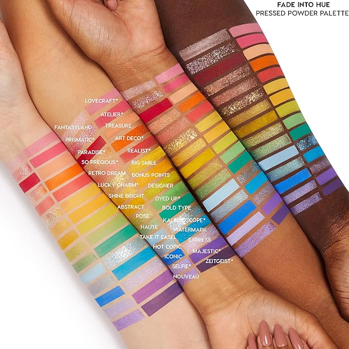 - Fade Into Hue - We finally did it, our rainbow mega palette is here! This fantasyland of abstract colours features a mixture of sparkling Metallics, blinged-out Pressed Glitters, and the richest Mattes that apply evenly and blend like a dream. One palette can really do it all.