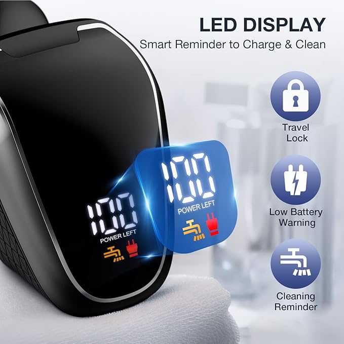- LED Intelligent Display: The bald head shaver for men with LED display can accurately show the percentage of the battery power. Low battery reminder, water washing reminder more intelligent. Long press the switch button for 3 seconds to trigger the travel lock to avoid additional power consumption. This electric shaver uses 600mAh large capacity battery, 2 hours of fast charging can provide 60 minutes of working time. Please charge it in time for regular use