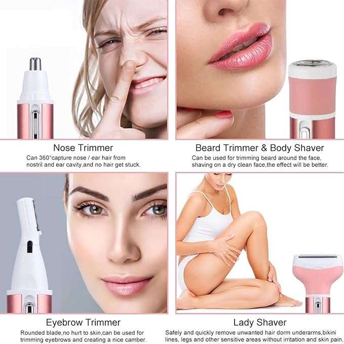 - 1.4-in-1 Electric Razor for Women-This Bikini Trimmer kit comes with 4 replaceable heads with different functions. 1 bikini trimmer, 1 nose hair trimmer, 1 short hair trimmer, 1eyebrow trimmer. Applicable to the body, face, underarms, bikini, eyebrow, nose etc.