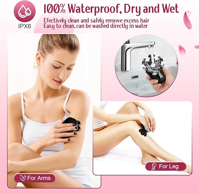 - Wet & Dry Shave: The whole body of the Razor is IPX6 waterproof, can be used in wet or dry conditions! Whether you want to dry shaving or refreshing wet shaving,this hair removal for ladies can satisfy all your needs.After each use, simply rinse the shaver under water for effortless cleaning and hygiene.