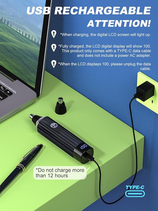 - Rechargeable with Type-C & Large Capacity Battery: Ginity nose hair trimmer features a uniquely designed USB charging interface, prioritizing charging safety by guarding against risks such as overvoltage, overcharging, and short circuits. Its powerful fast-charging capability allows it to reach full charge in just 2 hours, eliminating the hassle of frequently replacing AA batteries and significantly enhancing user convenience