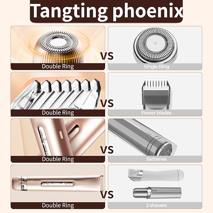 - π 2-in-1 Shaver & Trimmer for Total Body Grooming: Switch effortlessly between two built-in heads: a wide electric trimmer for bikini line, arms, and legs, and a precision round shaver for removing facial hair and peach fuzz.