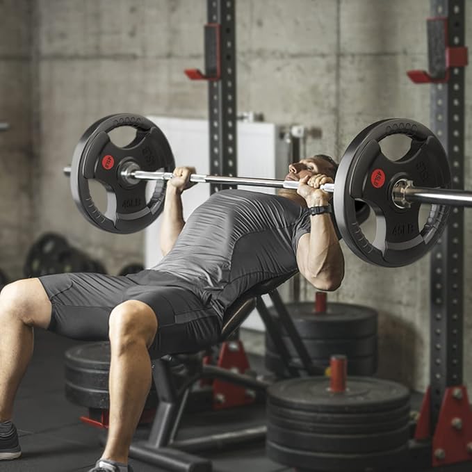 - Easy Grip - Each rubber weight plates has 3 large openings, easier grip to carry and loading & unloading, labeled in LB on the surface for fast recognition. Single plate is also great for warm up.